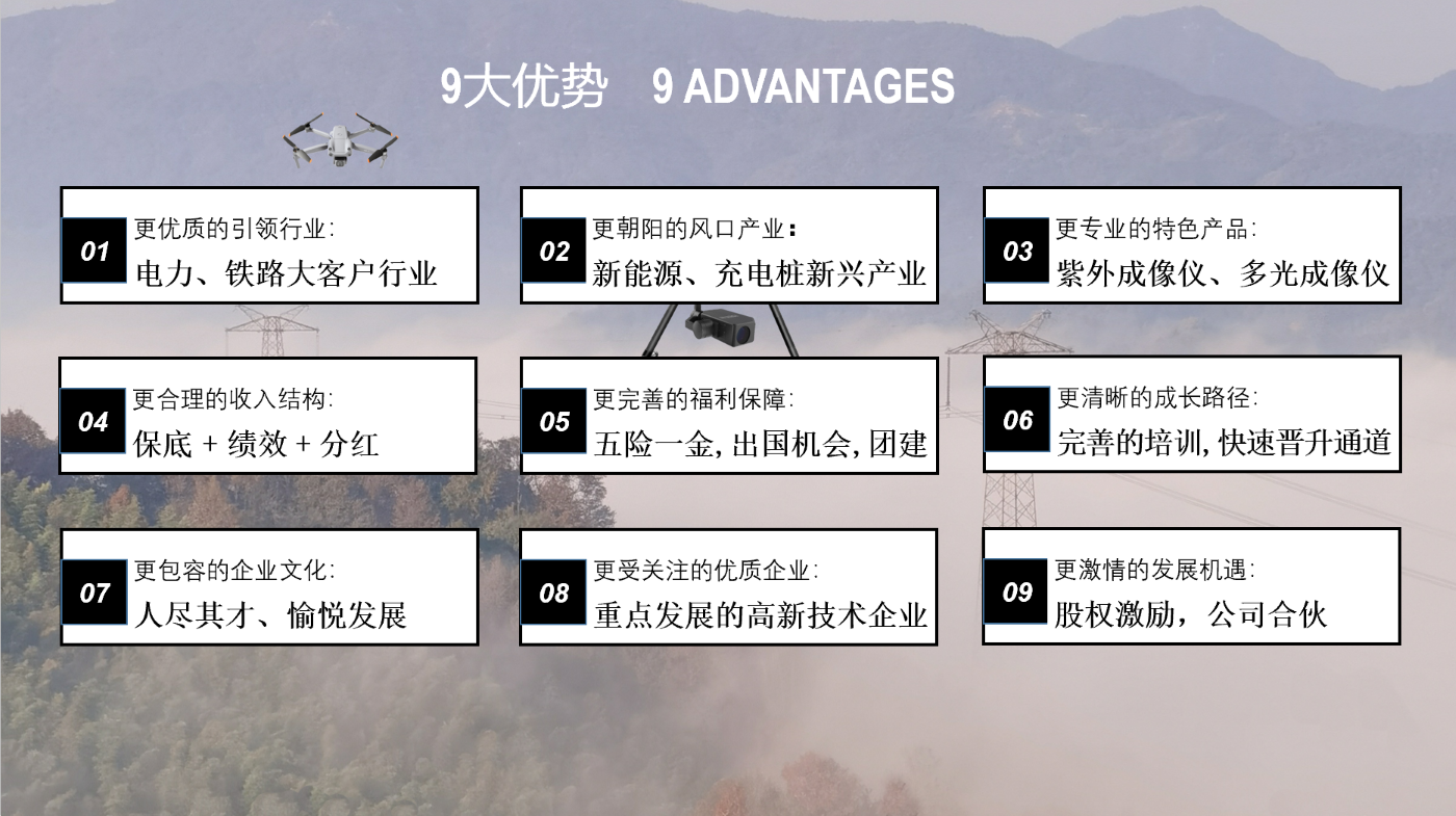 公司专注于紫外成像仪、多光成像仪、无人机、电力电工等先进电力测试仪器设备。公司愿景为全球能源可持续性发展提供高科技检测解决方案,努力成为全球优秀的电力测试仪器提供者。