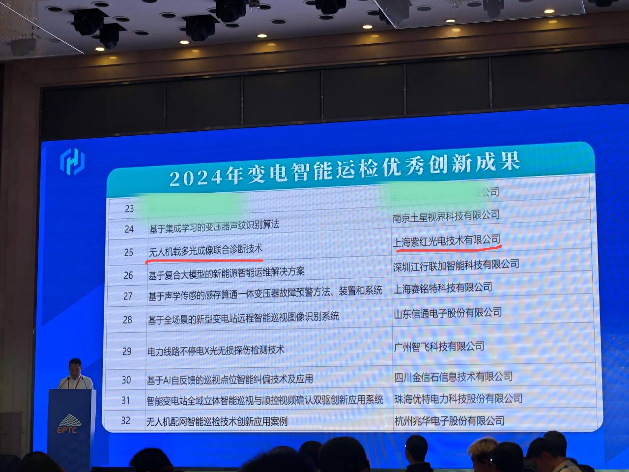 特别荣誉:在众多优秀企业的竞争中,上海紫红光电技术有限公司凭借无人机载多光成像联合诊断技术荣获“2024年度变电智能运检优秀创新成果”大奖,这是对我们团队在技术创新和持续努力上的肯定。